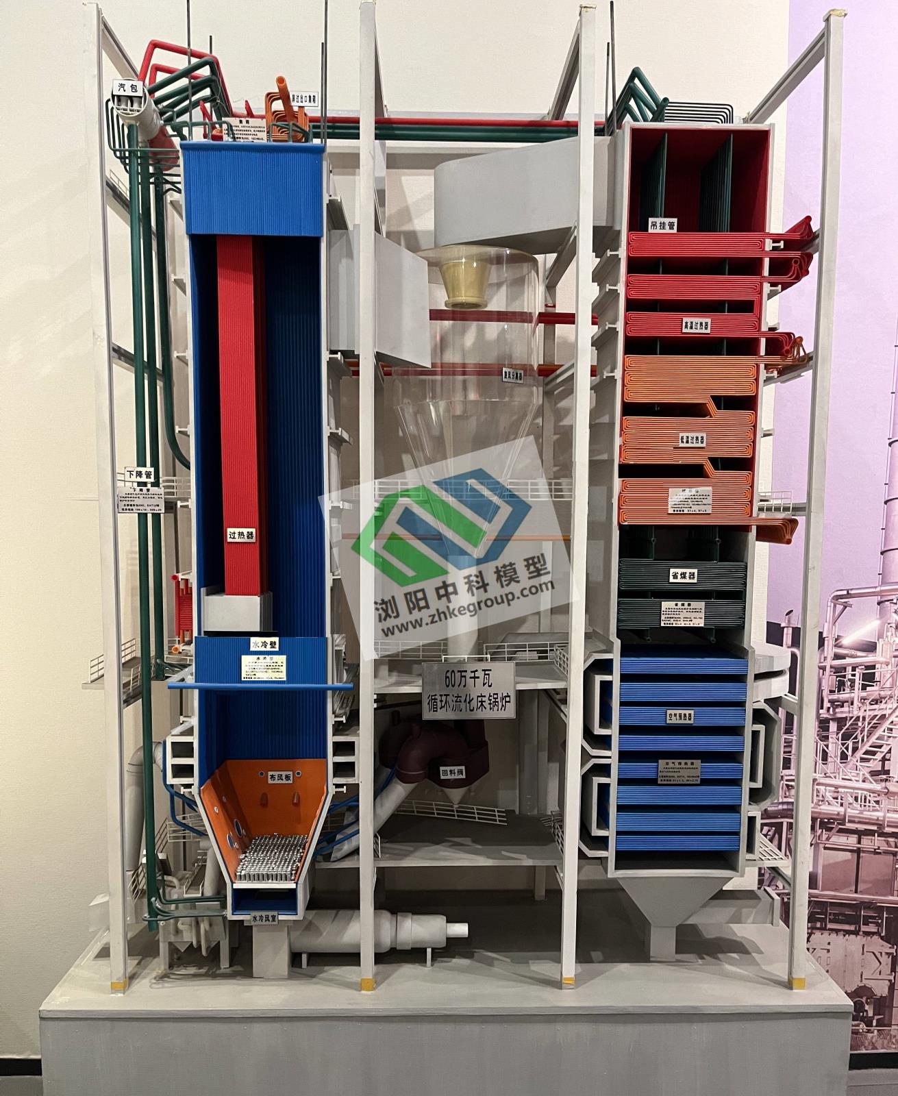 1)鍋爐本體爐膛剖視、結(jié)構(gòu)分色、系統(tǒng)全面、內(nèi)容準(zhǔn)確反映流化床鍋爐本體及系統(tǒng)組成;整體比例、色彩、內(nèi)容、功能模擬使人具有“身臨其境”的震撼感覺;